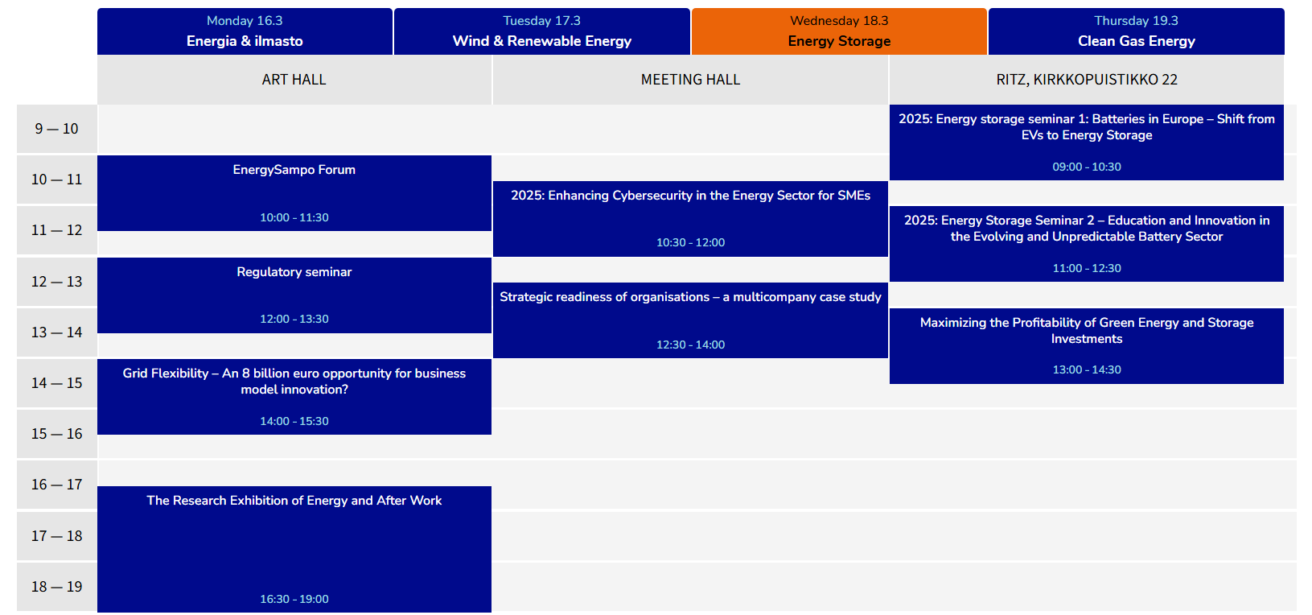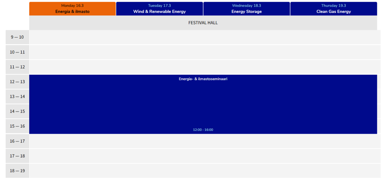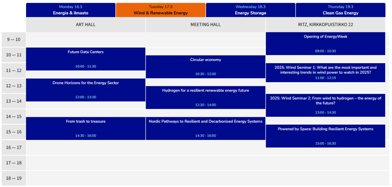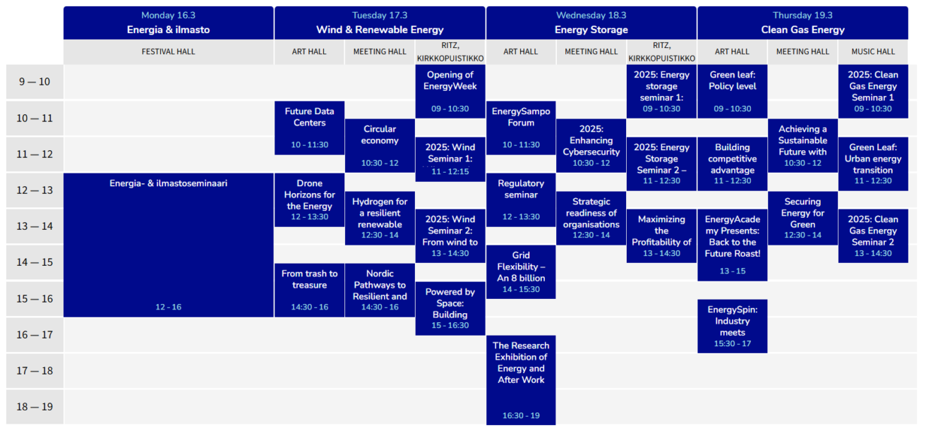 EnergyWeek has seminars during 4 days. We start of om Monday with the traditional (Energy & Climate seminar) Energia & Ilmastoseminaari that is the only seminar during EnergyWeek that is not in English.